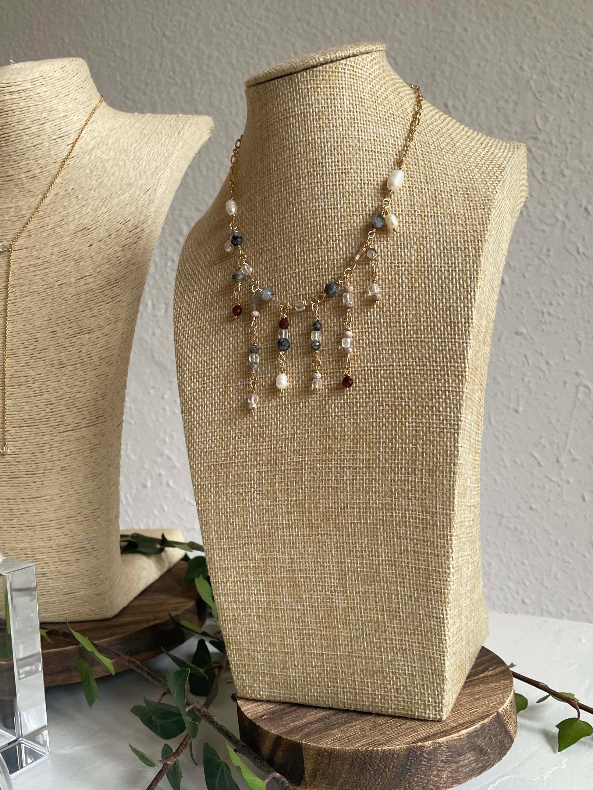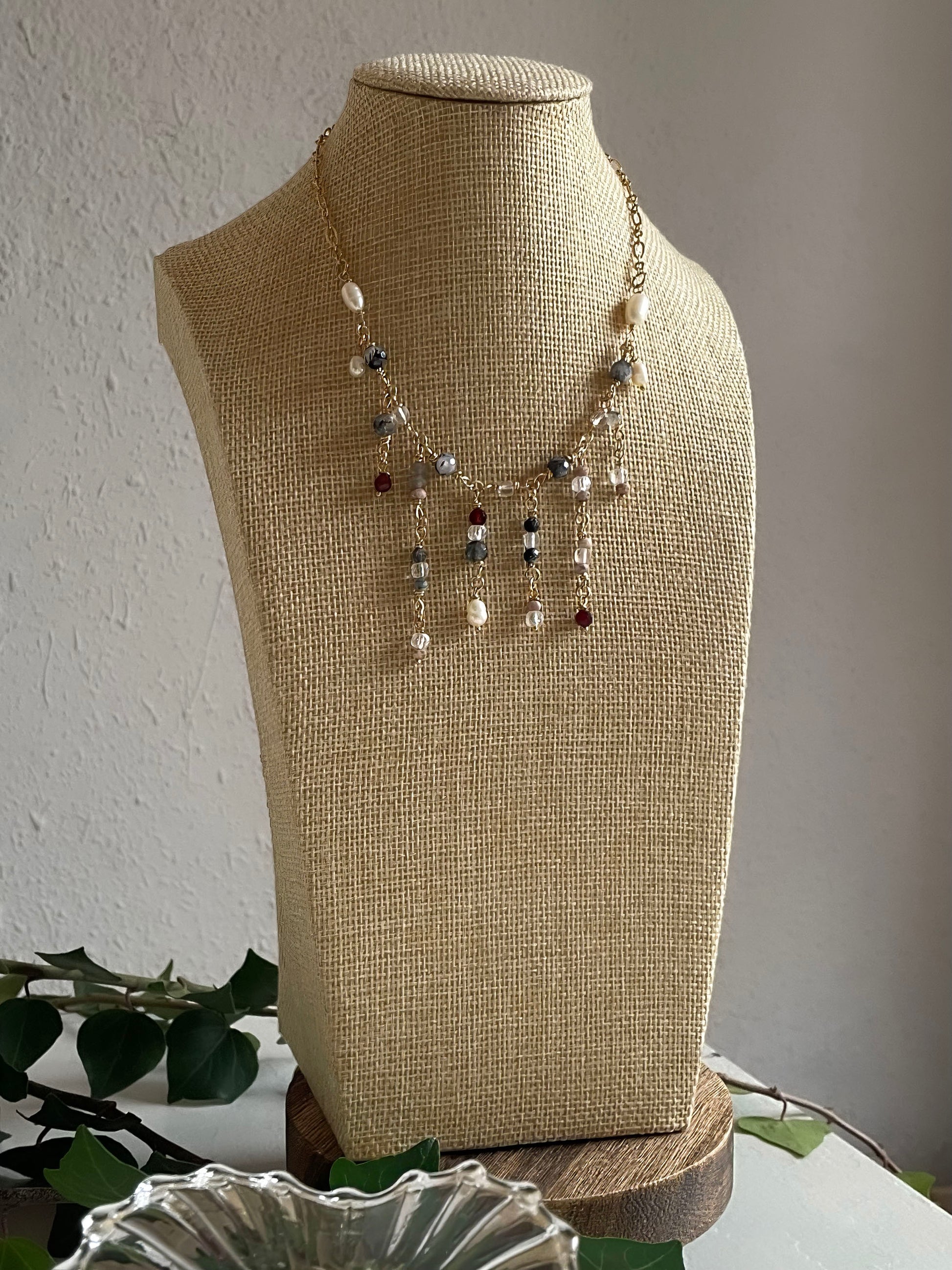 El choker Aura tiene ese "algo" especial, transmite elegancia y misterio. Hecho con cadena y engarces de latón con baño de tres micras en oro amarillo de 18 quilates y diferentes piedras naturales como el granate, cuarzo blanco, cuarzo turmalina, rodocrosita, labradorita y perlas de río.