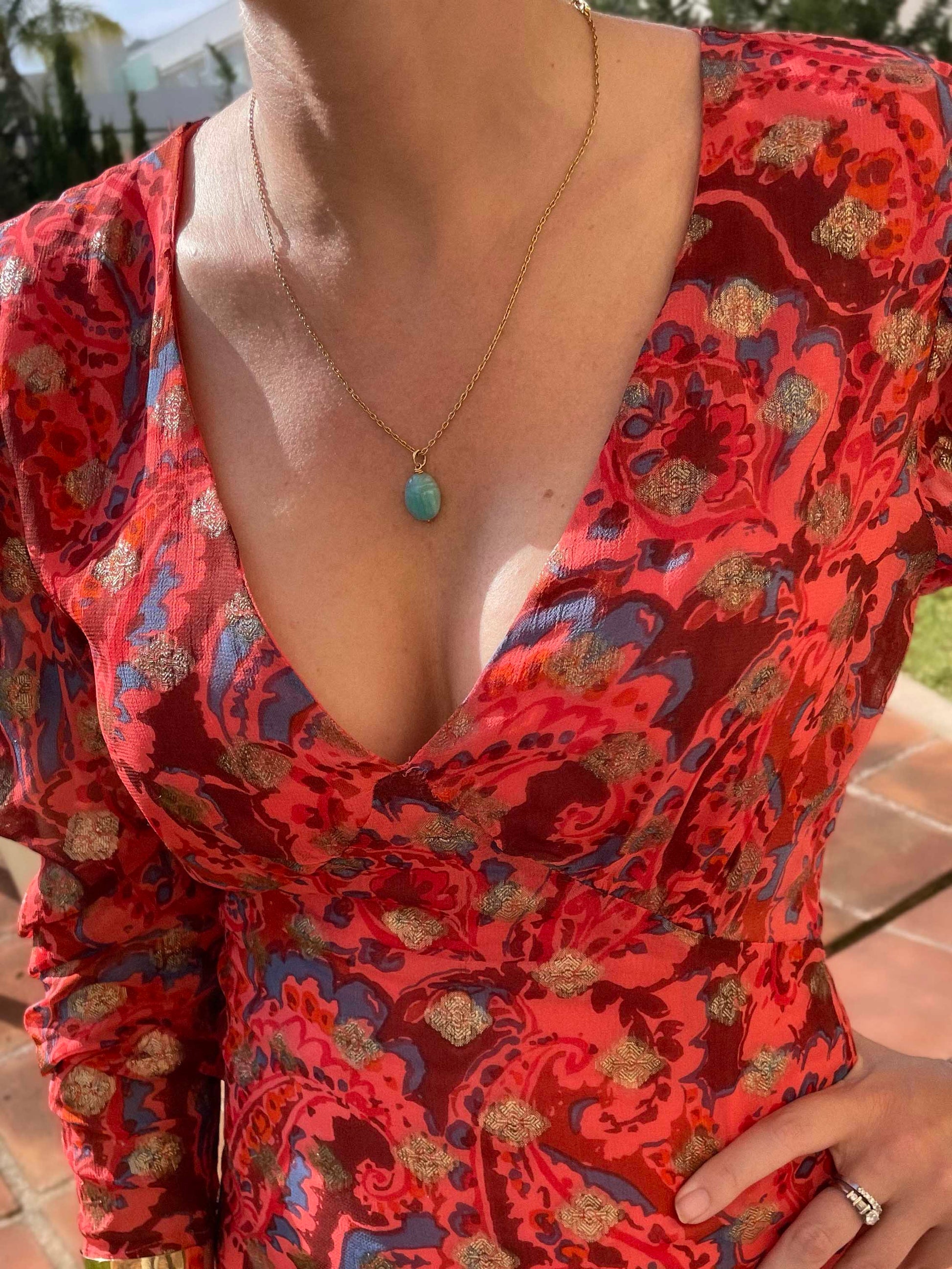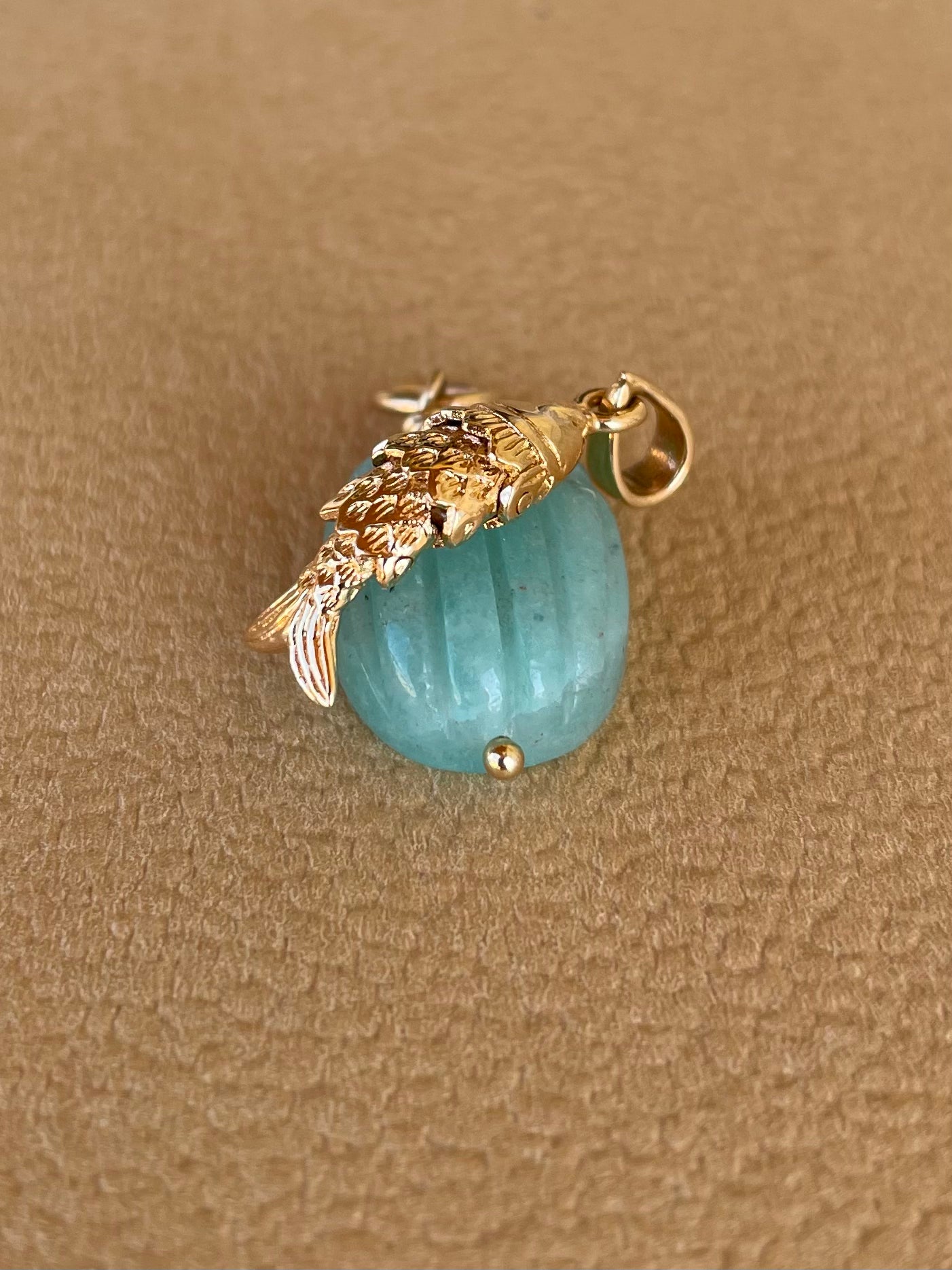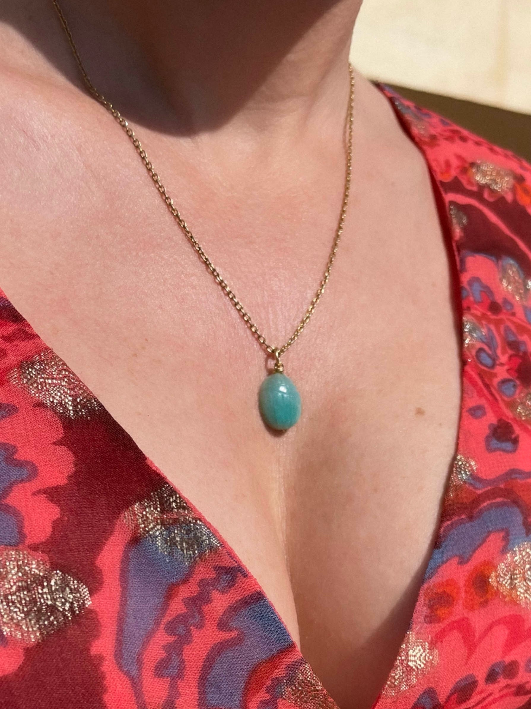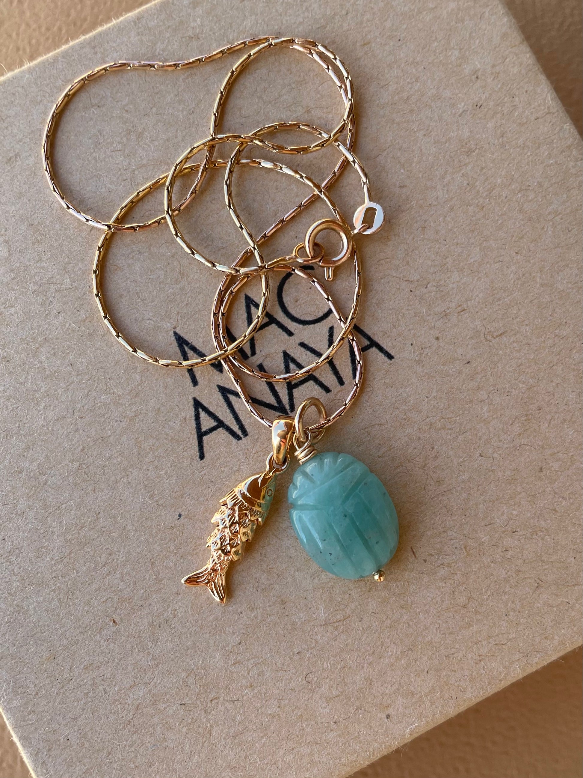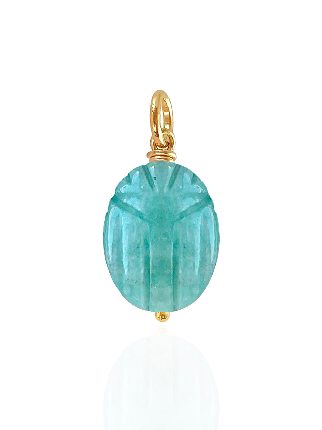 El escarabajo es símbolo de un nuevo amanecer y transformación hacia lo desconocido, portando su poder de protección. Colgante con escarabajo de amazonita tallado a mano con terminaciones en latón bañado en oro amarillo de 18 quilates. Las piedras naturales son únicas y pueden variar respecto a la fotografía. No incluye cadena.