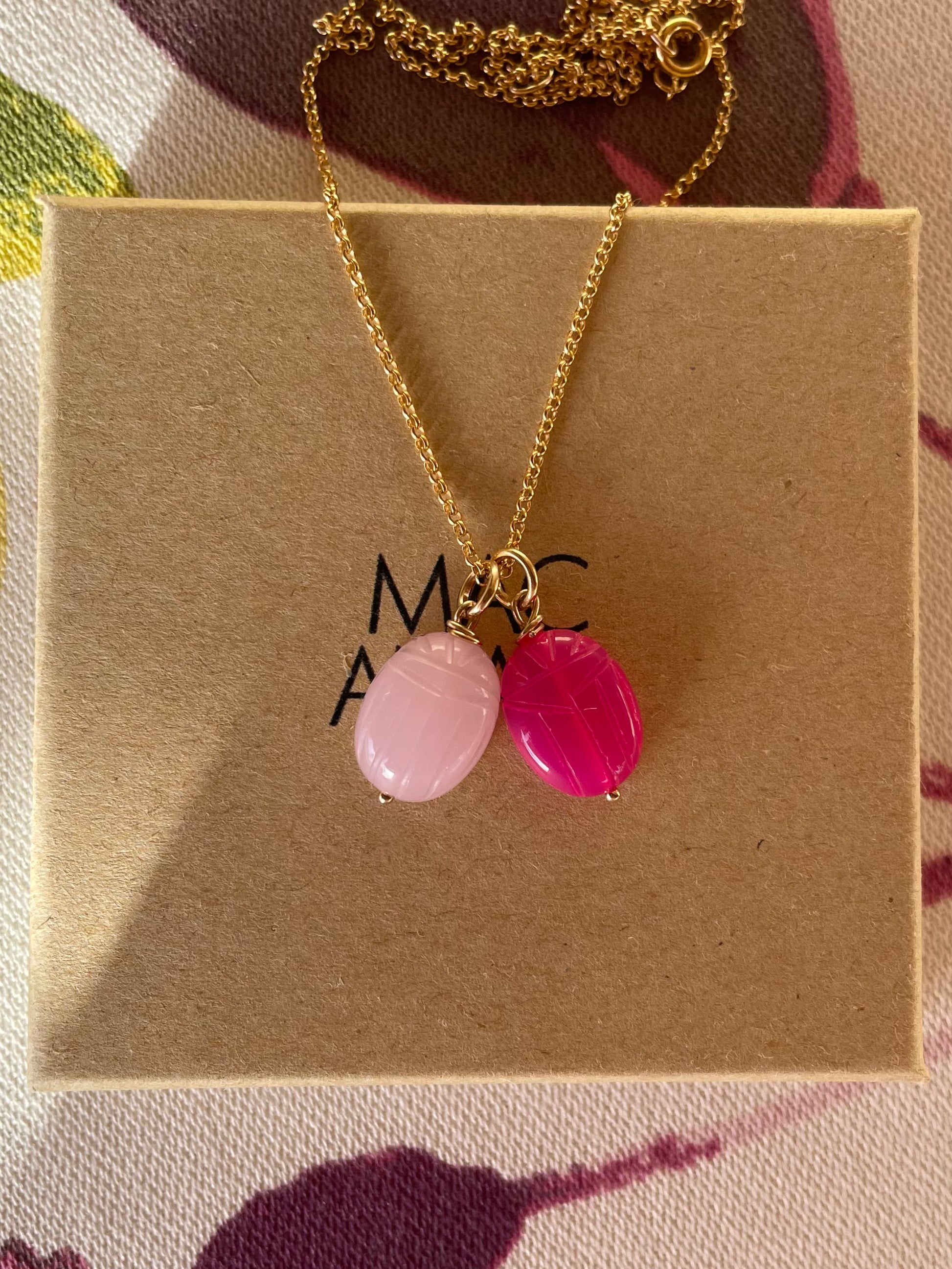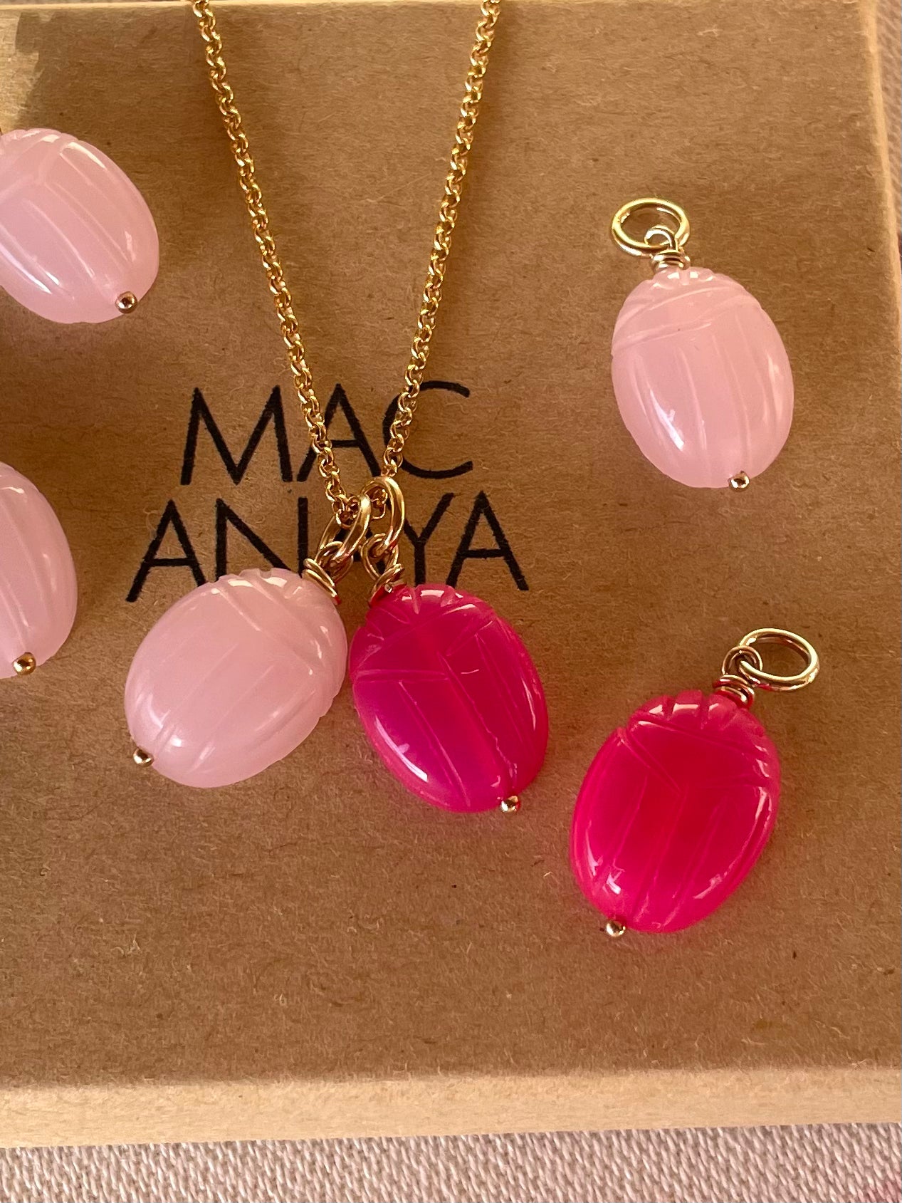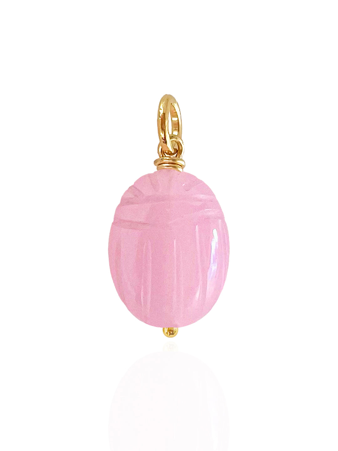 El escarabajo es símbolo de un nuevo amanecer y transformación hacia lo desconocido, portando su poder de protección. Colgante con escarabajo de calcedonia rosa tallado a mano con terminaciones en latón bañado en oro amarillo de 18 quilates. No incluye cadena.