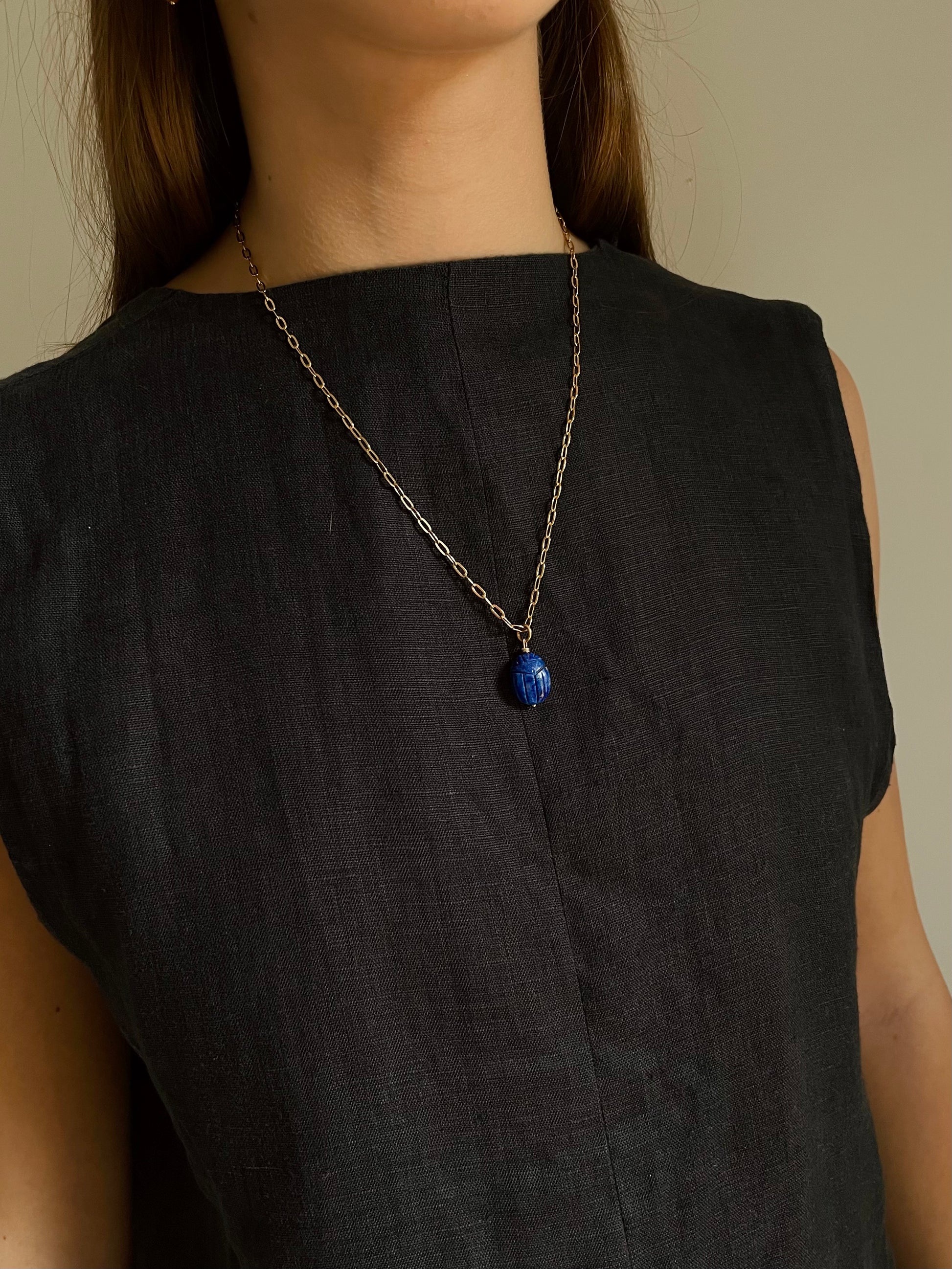 El escarabajo es símbolo de un nuevo amanecer y transformación hacia lo desconocido, portando su poder de protección. Colgante con escarabajo de lapislázuli tallado a mano con terminaciones en latón bañado en oro amarillo de 18 quilates. Las piedras naturales son únicas y pueden variar respecto a la fotografía. No incluye cadena.