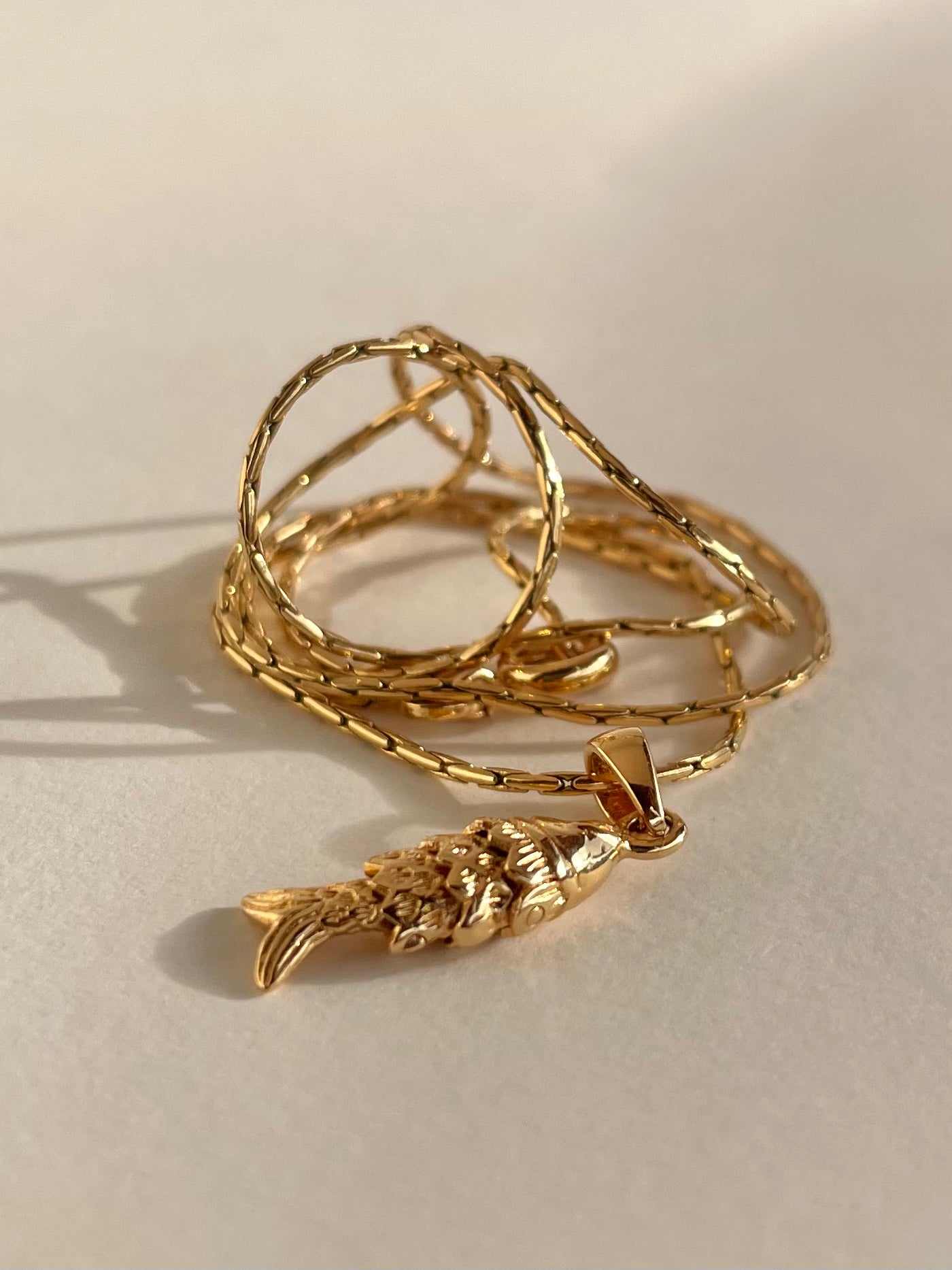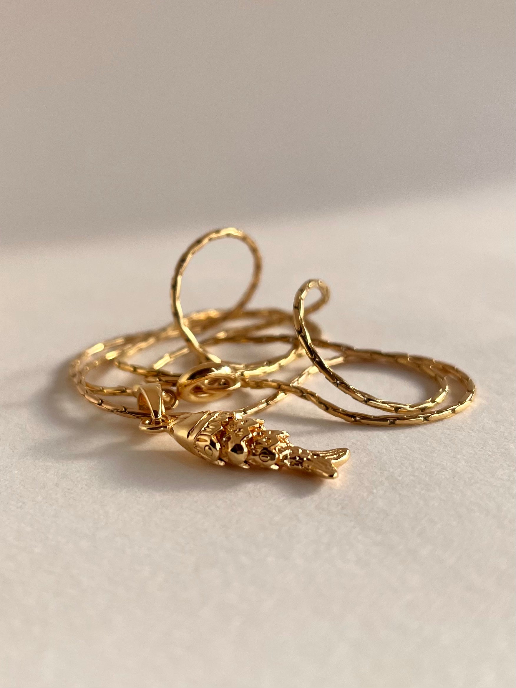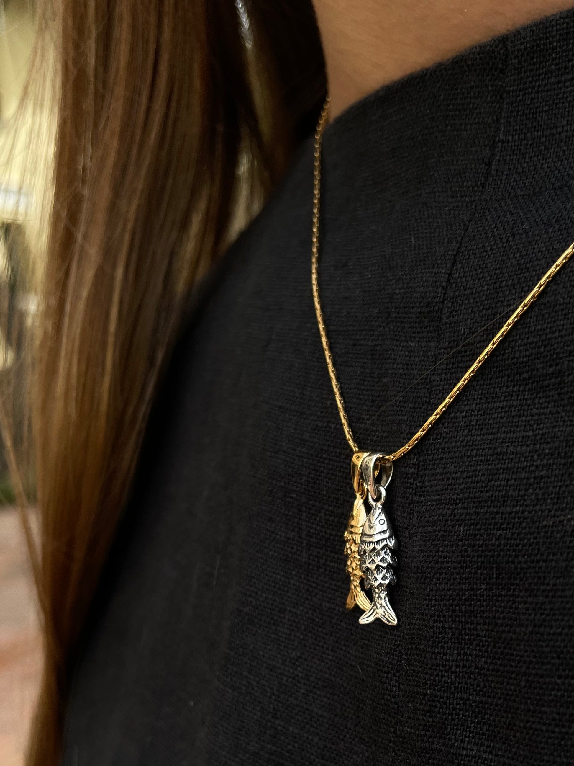 El colgante Poisson Oro simboliza abundancia y movimiento inspirados en el Mediterráneo. Este pequeño y elegante pez está compuesto por piezas conectadas, por lo que se mueve como lo haría en el mar. Hecho en latón con baño de tres micras en oro amarillo de 18 quilates. Cadena no incluida, compatible con cadenas N2 Twiggy y N3 Bolitas.