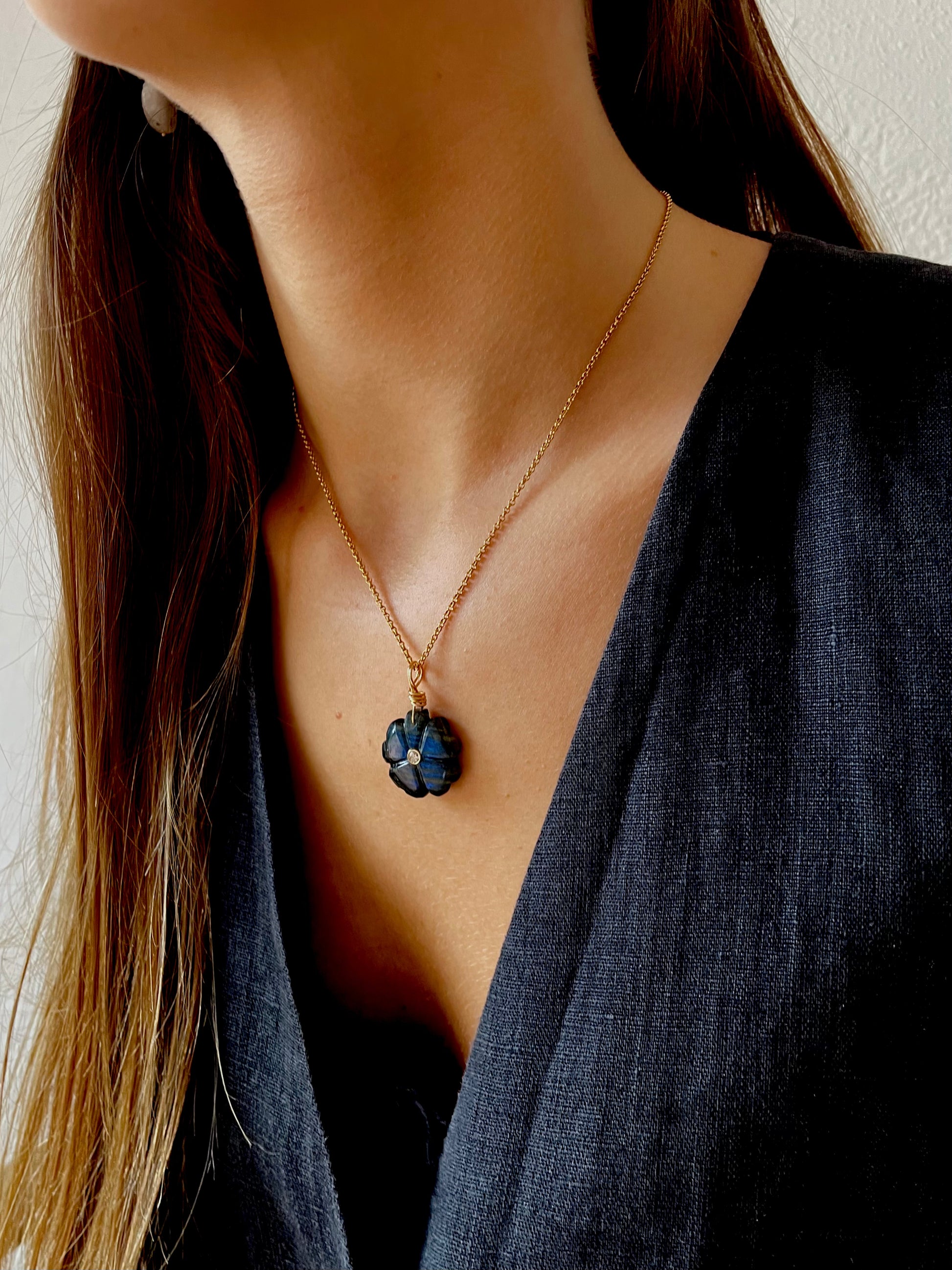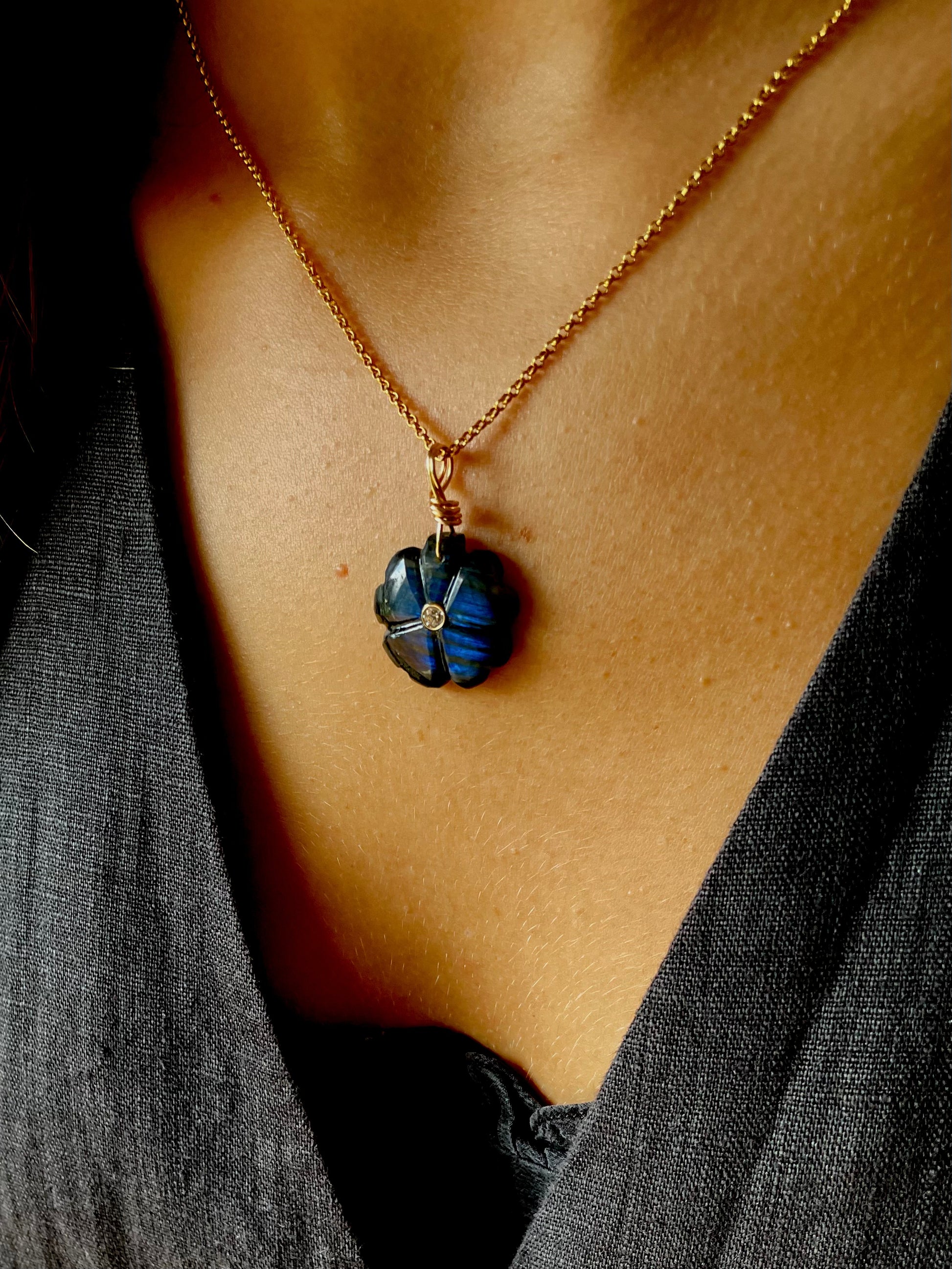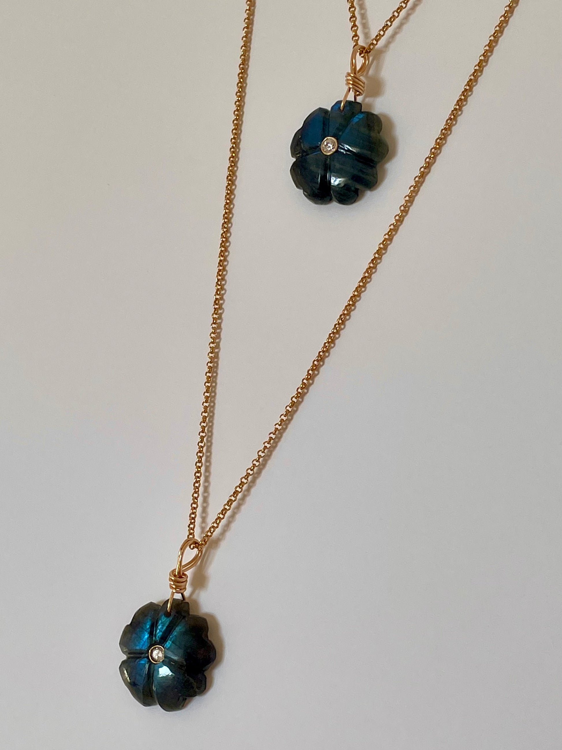 La Colección Fortunato son flores de piedra talladas a mano por artesanos. Las piedras son seleccionadas cuidadosamente por su belleza. Collar Fortunato de labradorita iridiscente con centro de circonita y cadena Rock And Rolo en latón bañado en oro amarillo de 18 quilates. Las piedras naturales son únicas y pueden variar respecto a la fotografía. Elige el largo de tu cadena 40 / 50 / 60 cm.