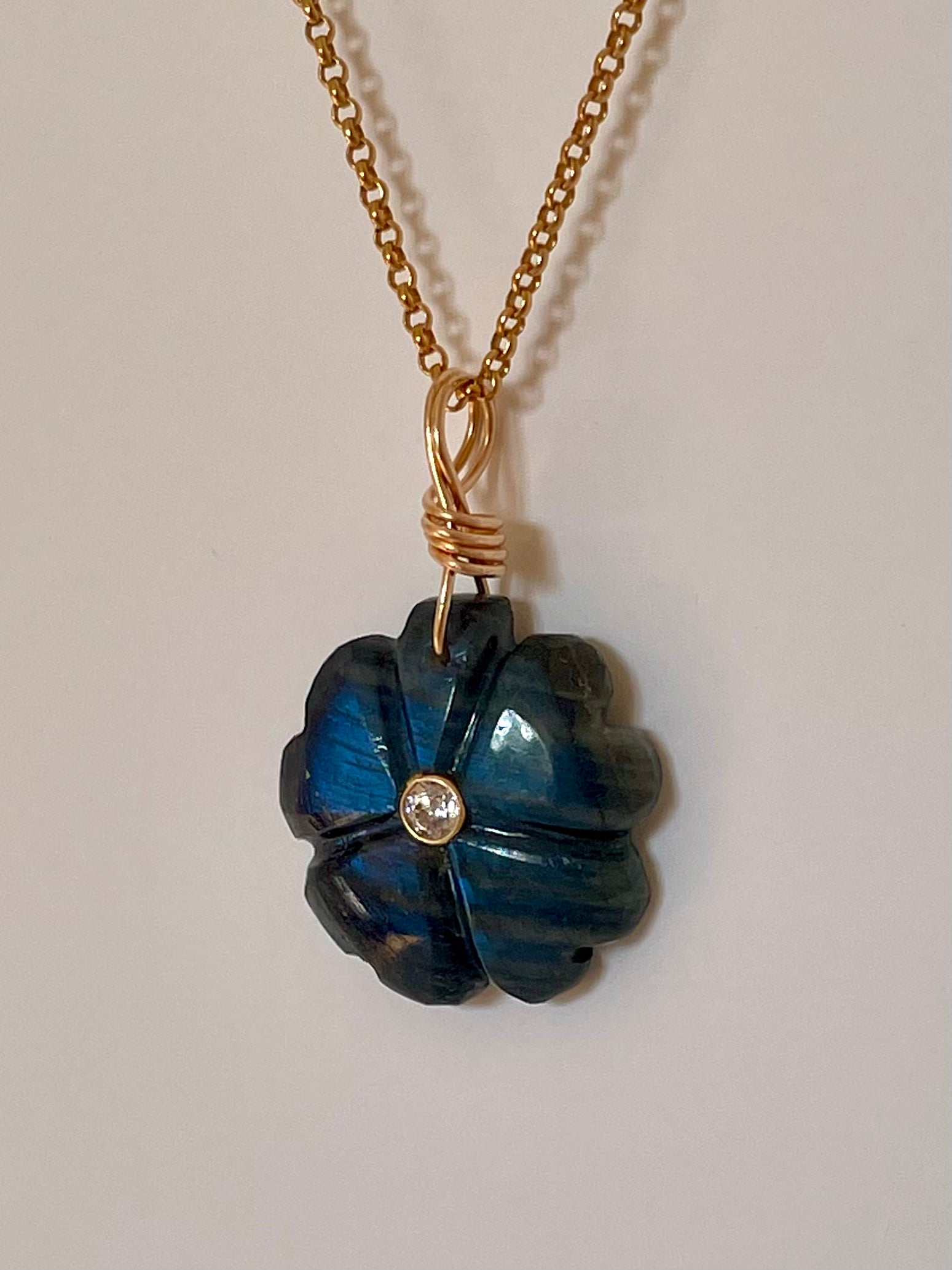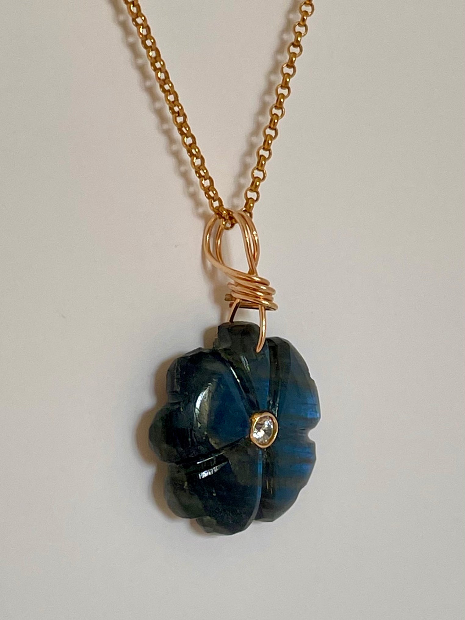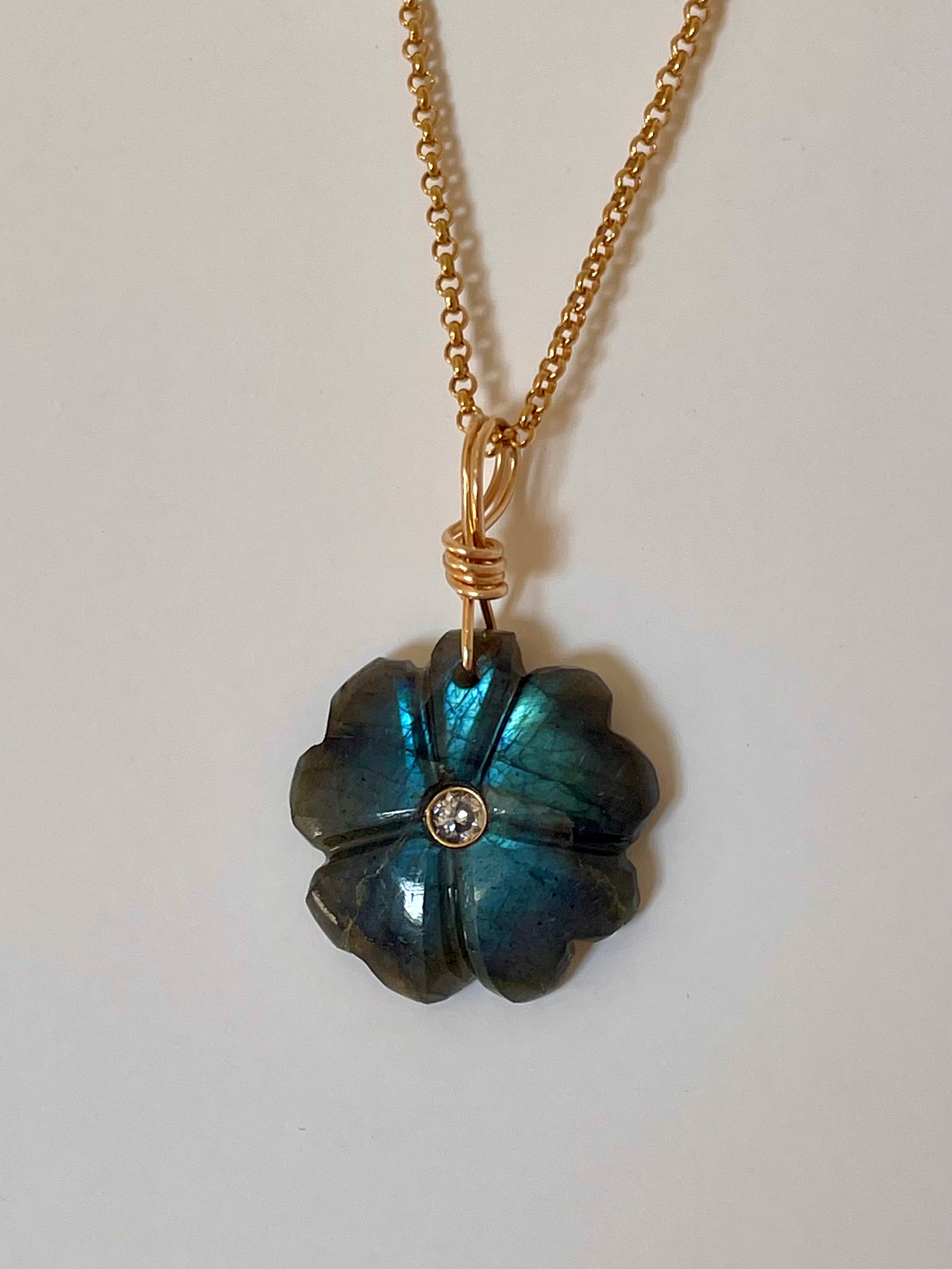La Colección Fortunato son flores de piedra talladas a mano por artesanos. Las piedras son seleccionadas cuidadosamente por su belleza. Collar Fortunato de labradorita iridiscente con centro de circonita y cadena Rock And Rolo en latón bañado en oro amarillo de 18 quilates. Las piedras naturales son únicas y pueden variar respecto a la fotografía. Elige el largo de tu cadena 40 / 50 / 60 cm.