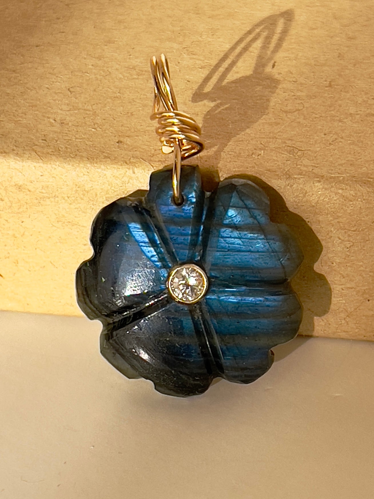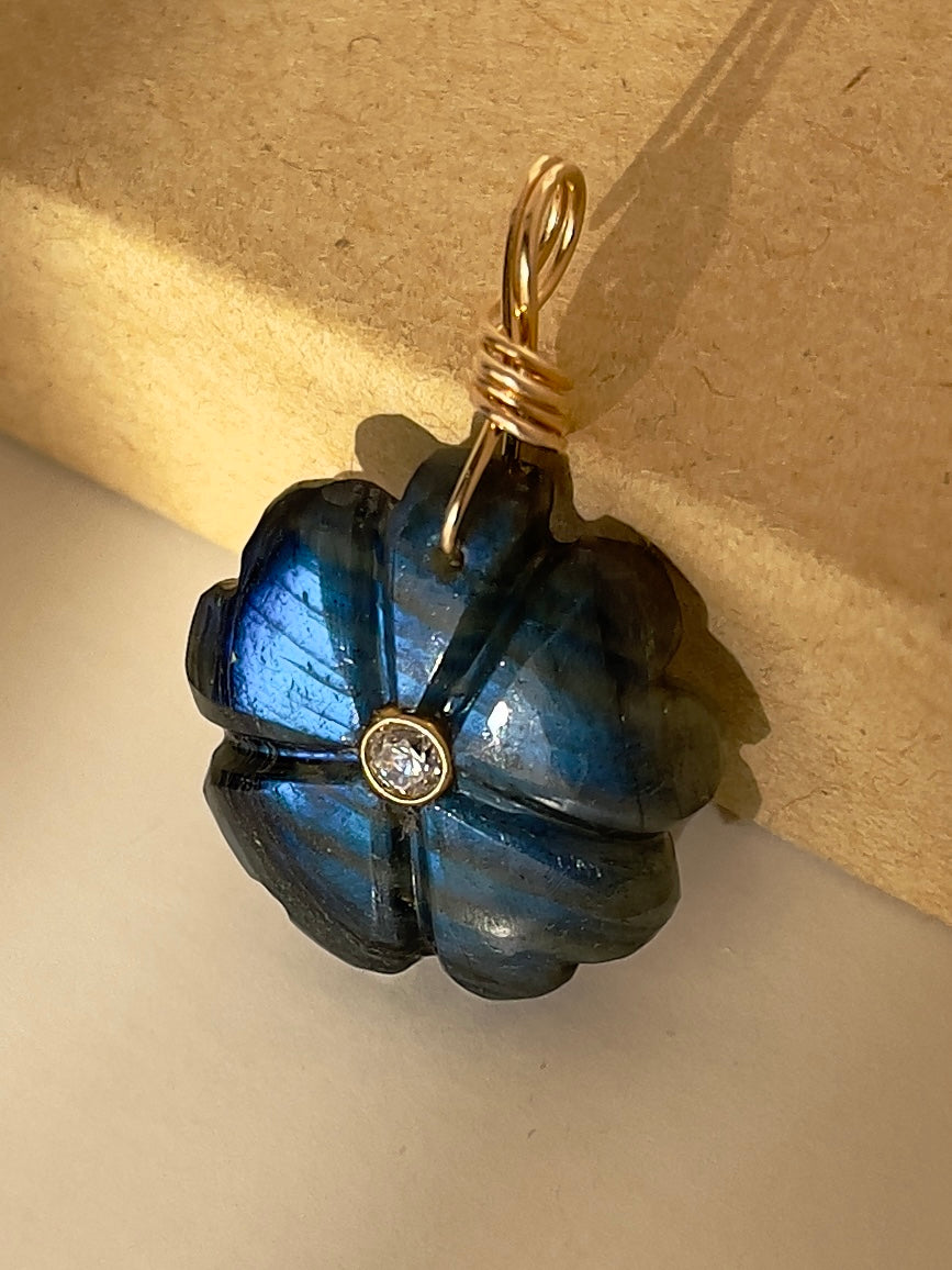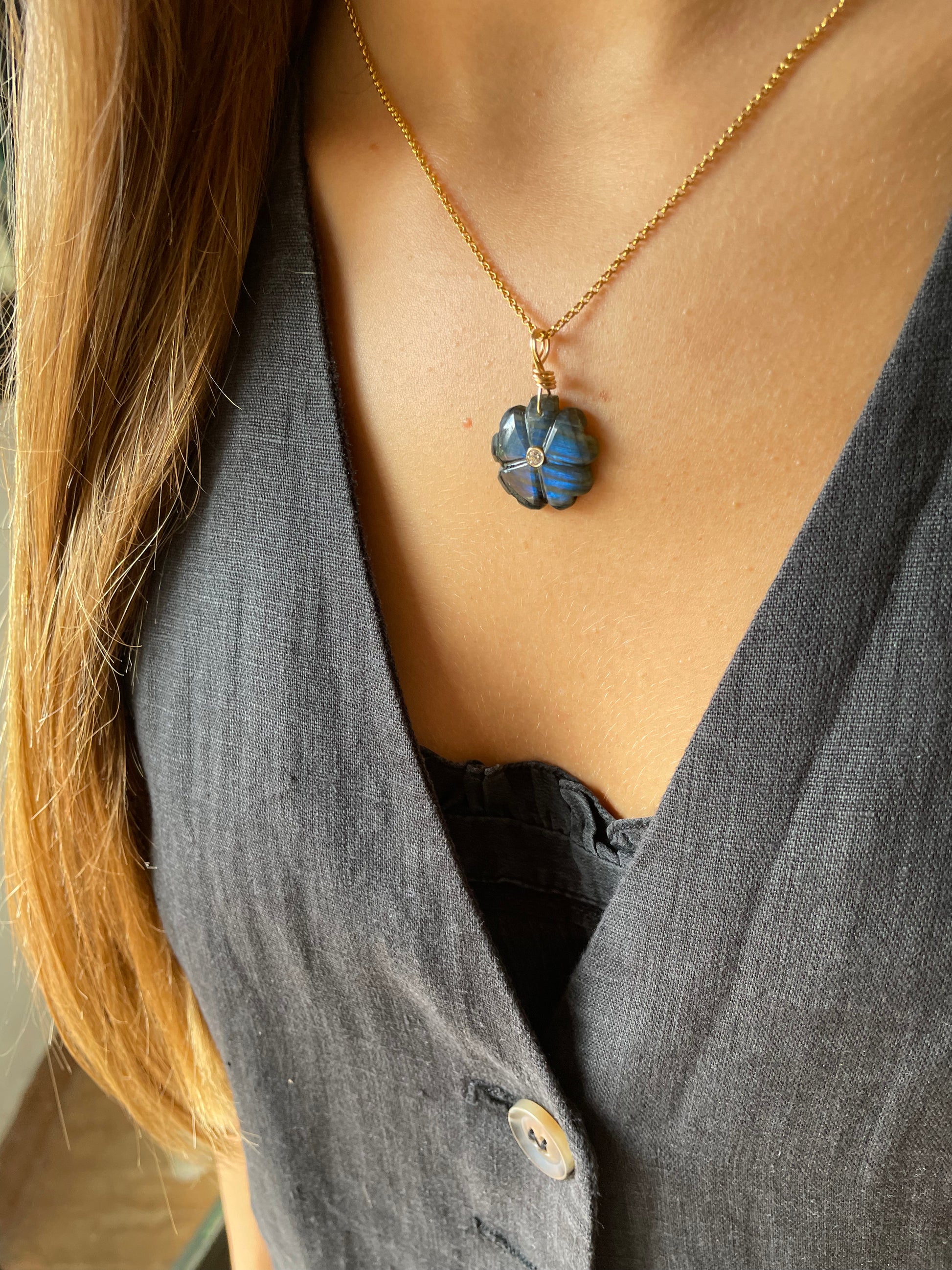 La Colección Fortunato son flores de piedra talladas a mano por artesanos. Las piedras son seleccionadas cuidadosamente por su belleza. Colgante Fortunato de labradorita iridiscente con centro de circonita engarzado en latón bañado en oro amarillo de 18 quilates. Las piedras naturales son únicas y pueden variar respecto a la fotografía.