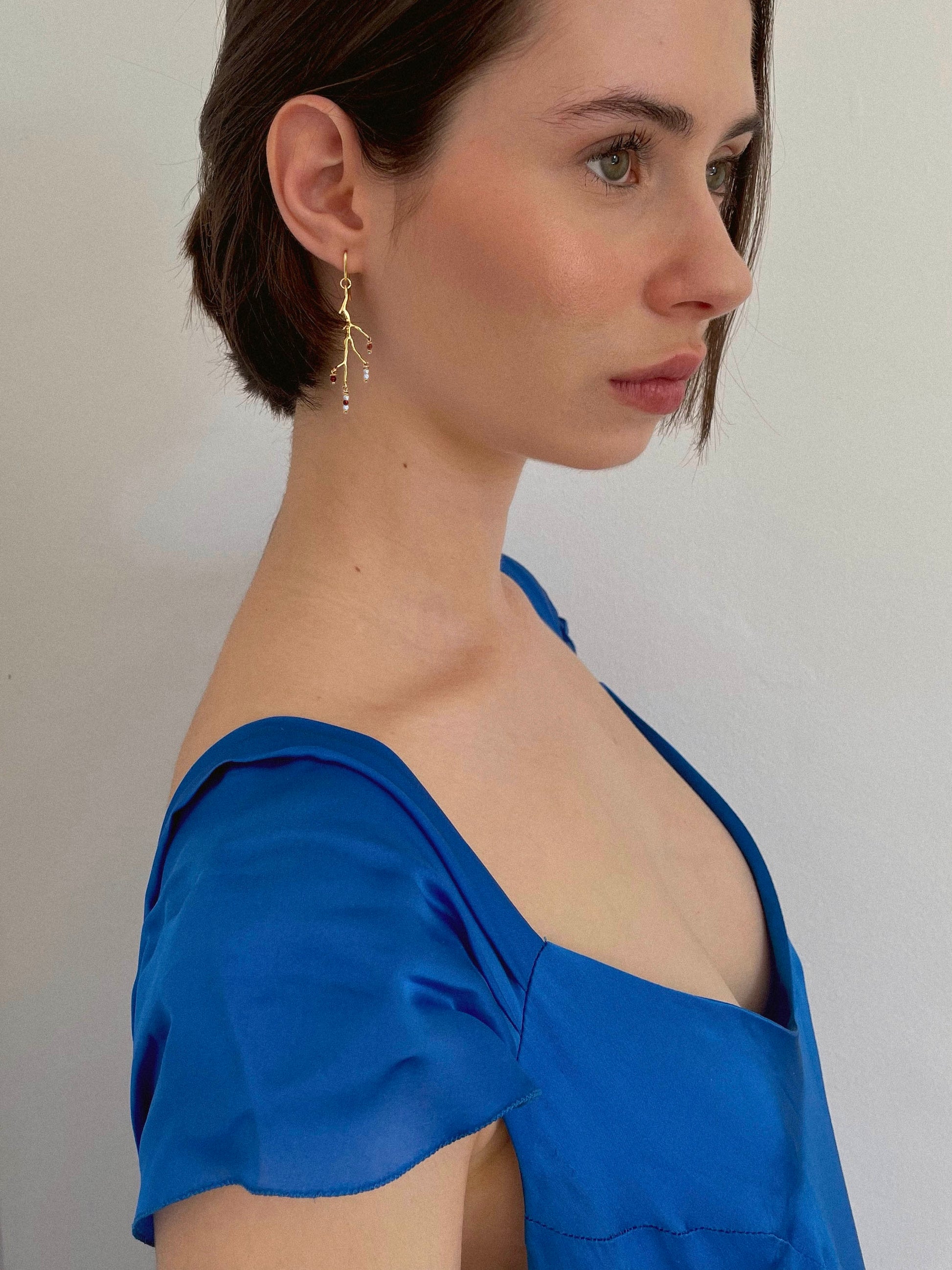 Amulette como símbolo de fortuna, el coral en diferentes culturas es considerado un amuleto de la buena suerte. Las pequeñas piedras que lo adornan representan los colores del coral rojo y el mar. Pendientes hechos en latón con baño de tres micras en oro amarillo de 16 quilates, terminados con piedras tanzanitas y cristales color granate. Las piedras naturales son únicas y pueden variar respecto a la fotografía. Se vende el par.