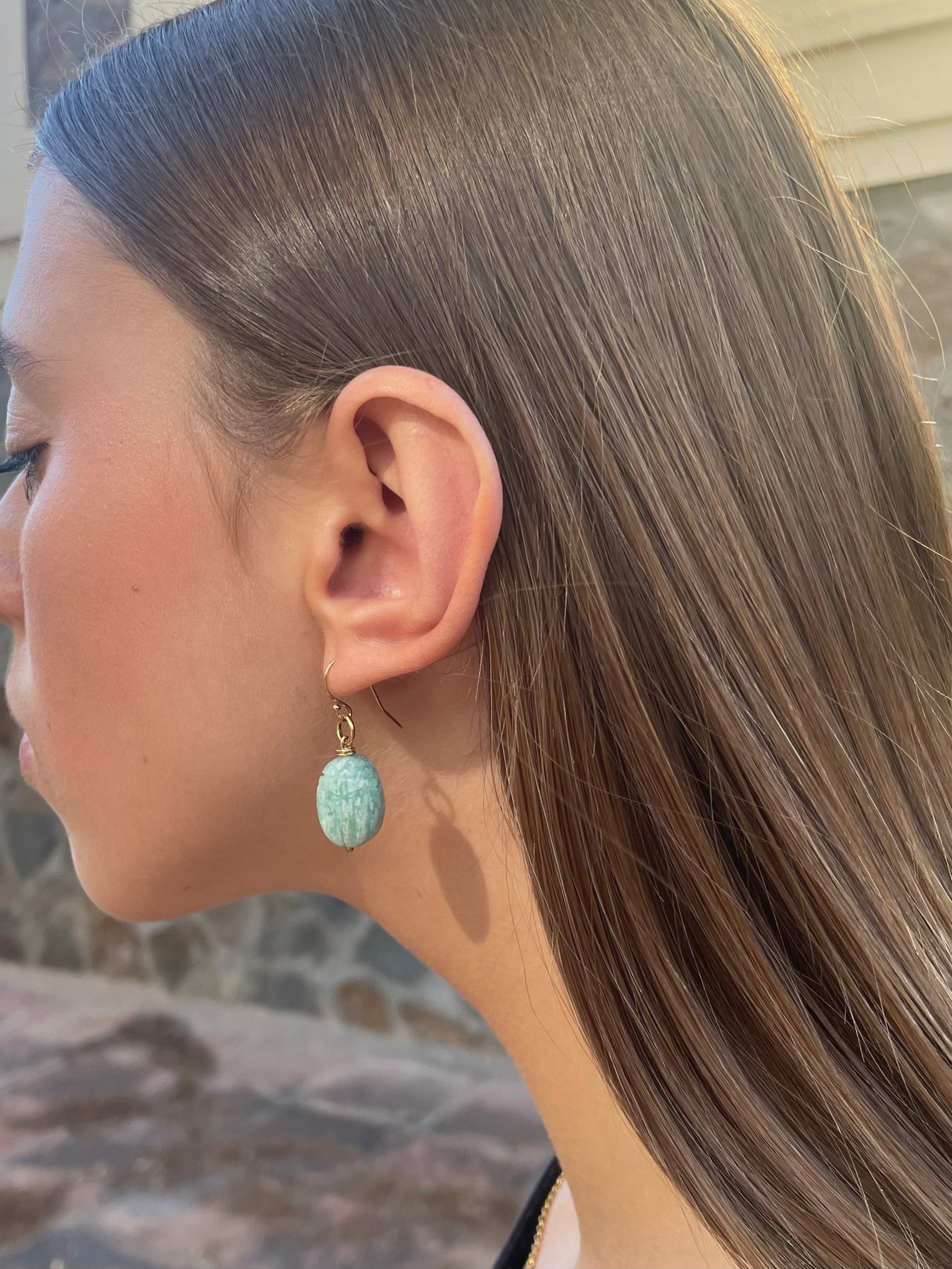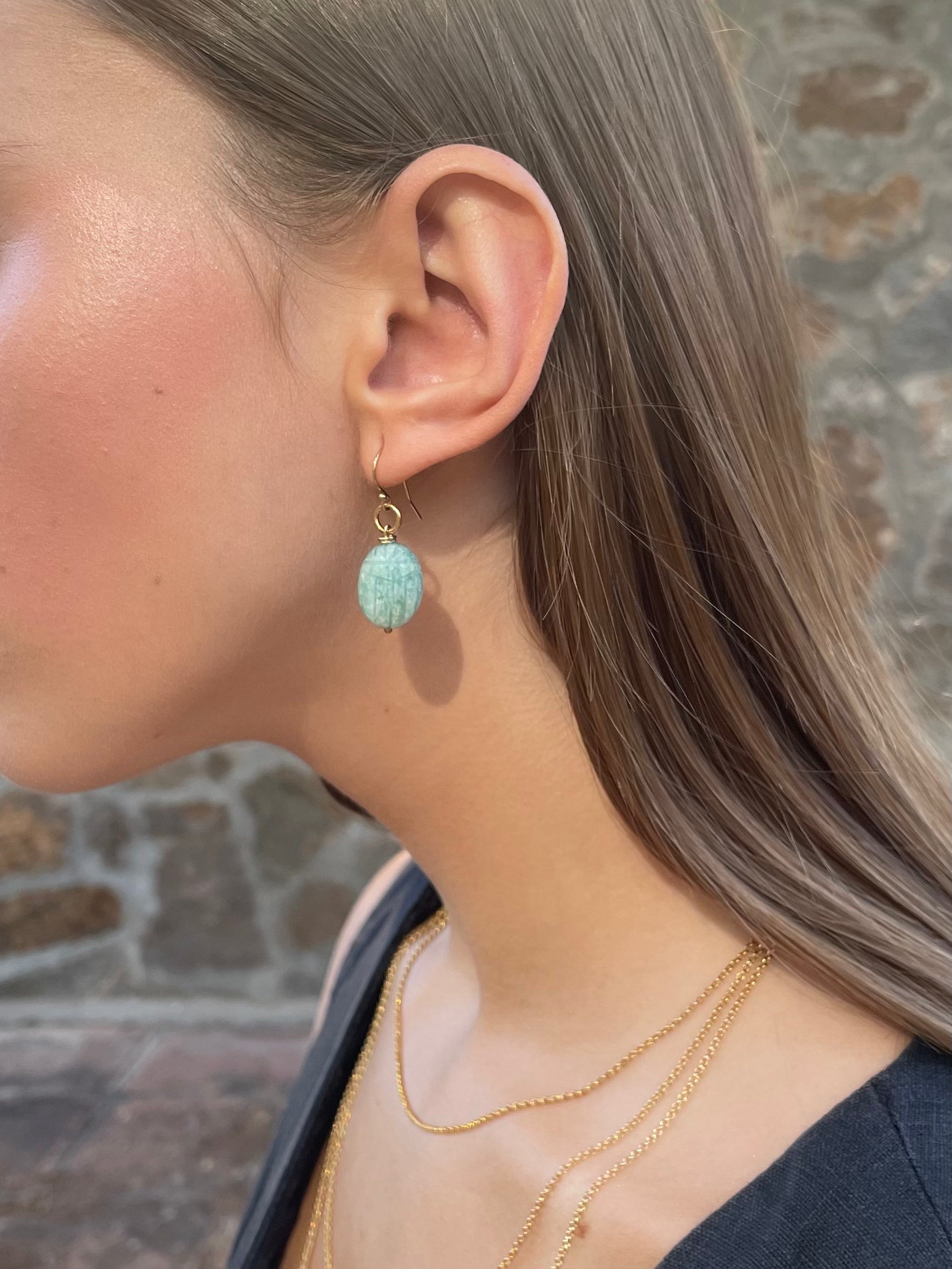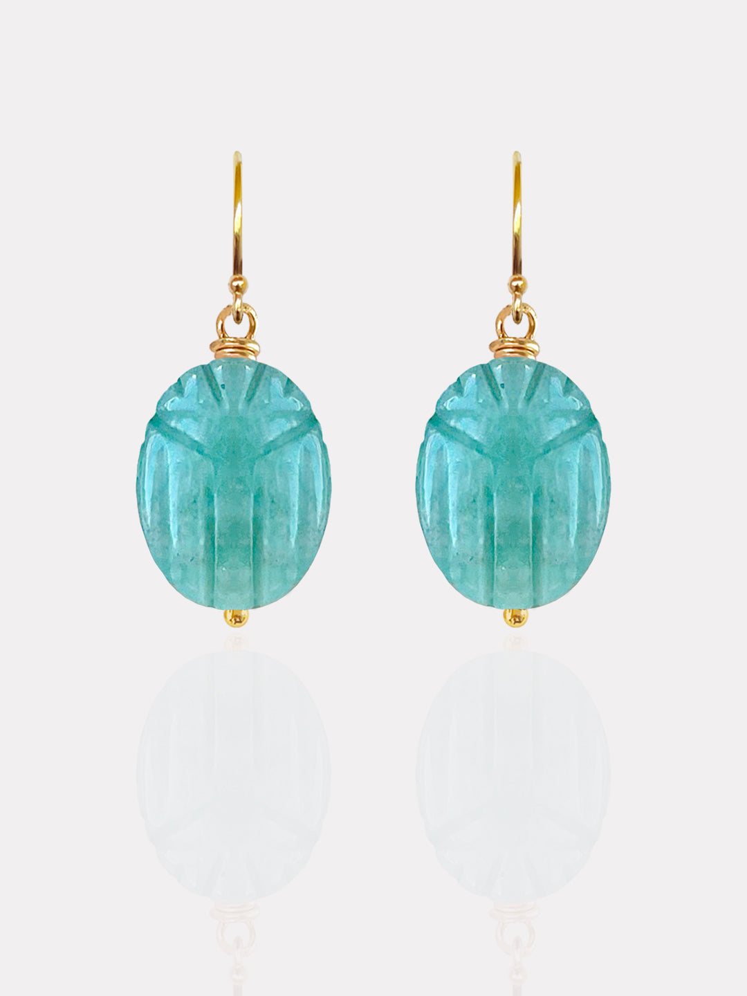 El escarabajo es símbolo de un nuevo amanecer, transformación hacia lo desconocido con su poder de protección al que acompaña. Pendientes de piedra amazonita natural tallada a mano con terminaciones en latón bañado en oro amarillo de 18 quilates. Las piedras naturales son únicas y pueden variar respecto a la fotografía. Se vende el par.