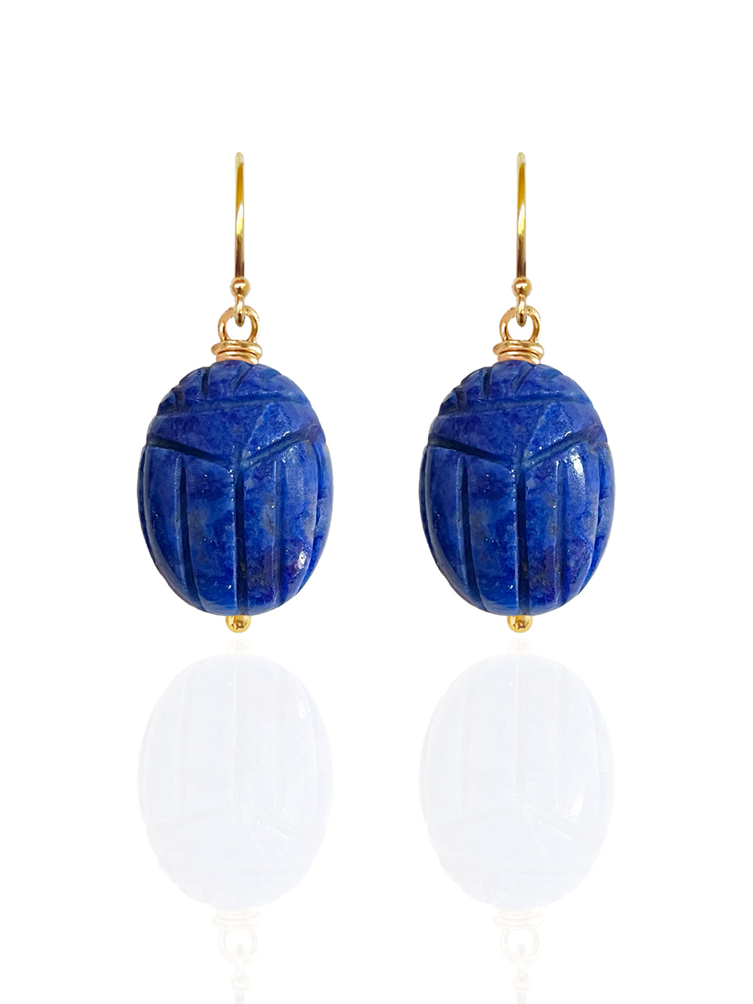 El escarabajo es símbolo de un nuevo amanecer, transformación hacia lo desconocido con su poder de protección al que acompaña. Pendientes de piedra lapislázuli natural tallada a mano con terminaciones en latón bañado en oro amarillo de 18 quilates. Las piedras naturales son únicas y pueden variar respecto a la fotografía. Se vende el par.